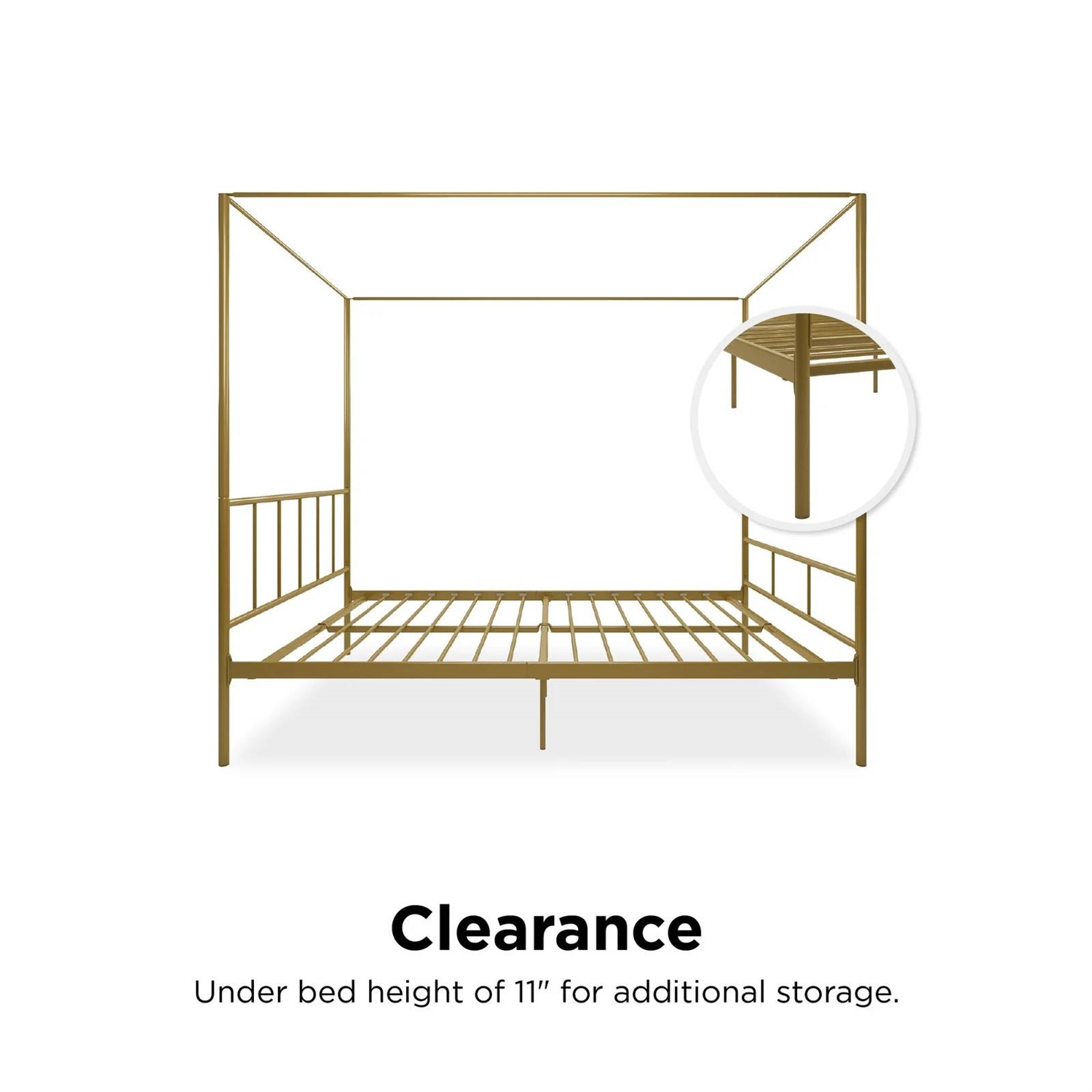 The Full size Modern Canopy Bed Frame with Headboard and Footboard in Gold Metal is a stylish and classy addition to any bedroom. Designed with a clean silhouette, this eye-catching modern platform bed frame is crafted in solid and sturdy metal that is stable and durable with secure metal slats with side rails to keep your mattress in place. It comes with a sophisticated headboard and footboard and with metal side rails and center legs to provide full support and comfort to you and your mattress without the need for a box spring. The Full size Modern Canopy Bed Frame with Headboard and Footboard in Gold Metal is also practical, with 11 inches of clearance underneath, ideal storage bins and organizers. Available in Full, Queen or King size, this four poster bed frame will become the centerpiece of your room!
